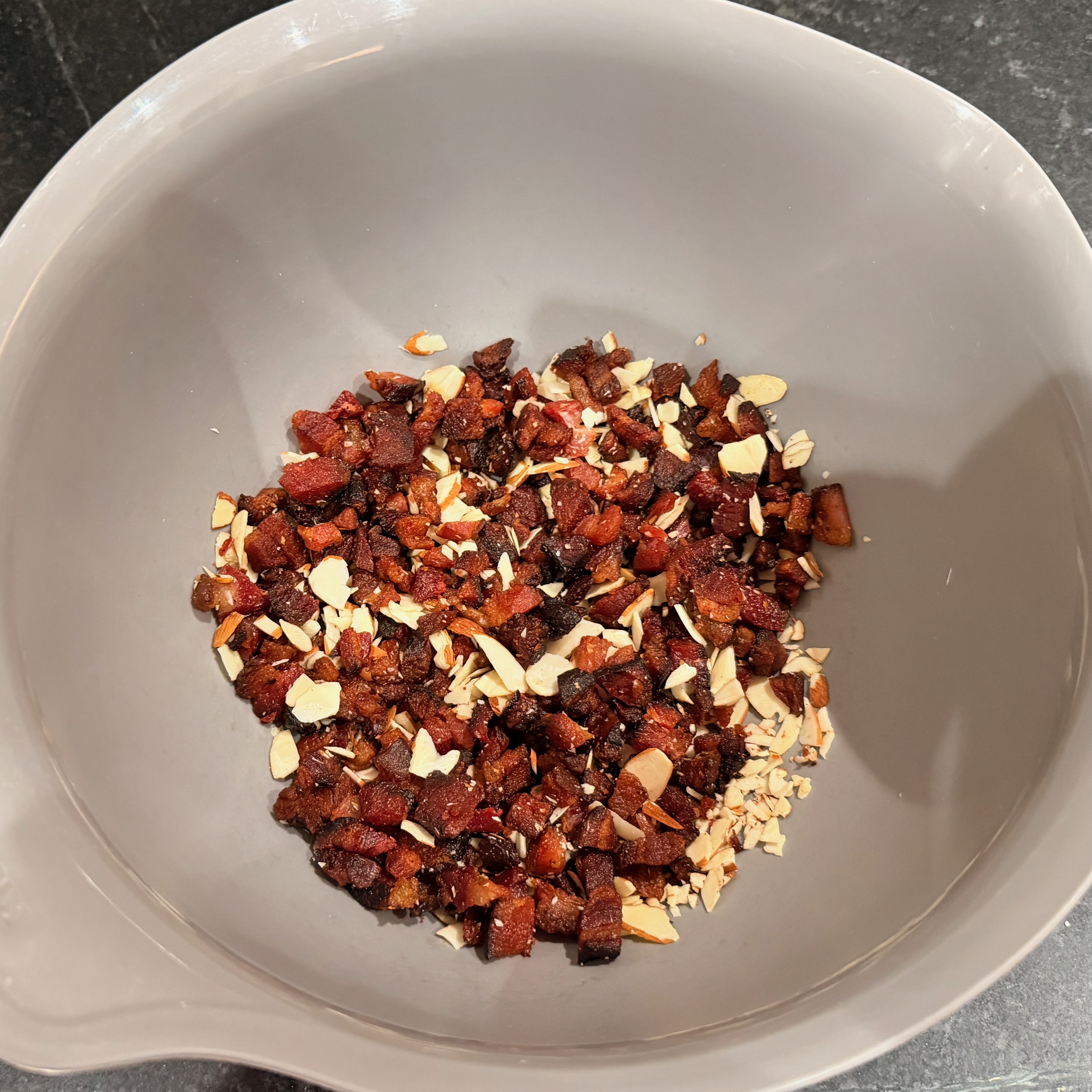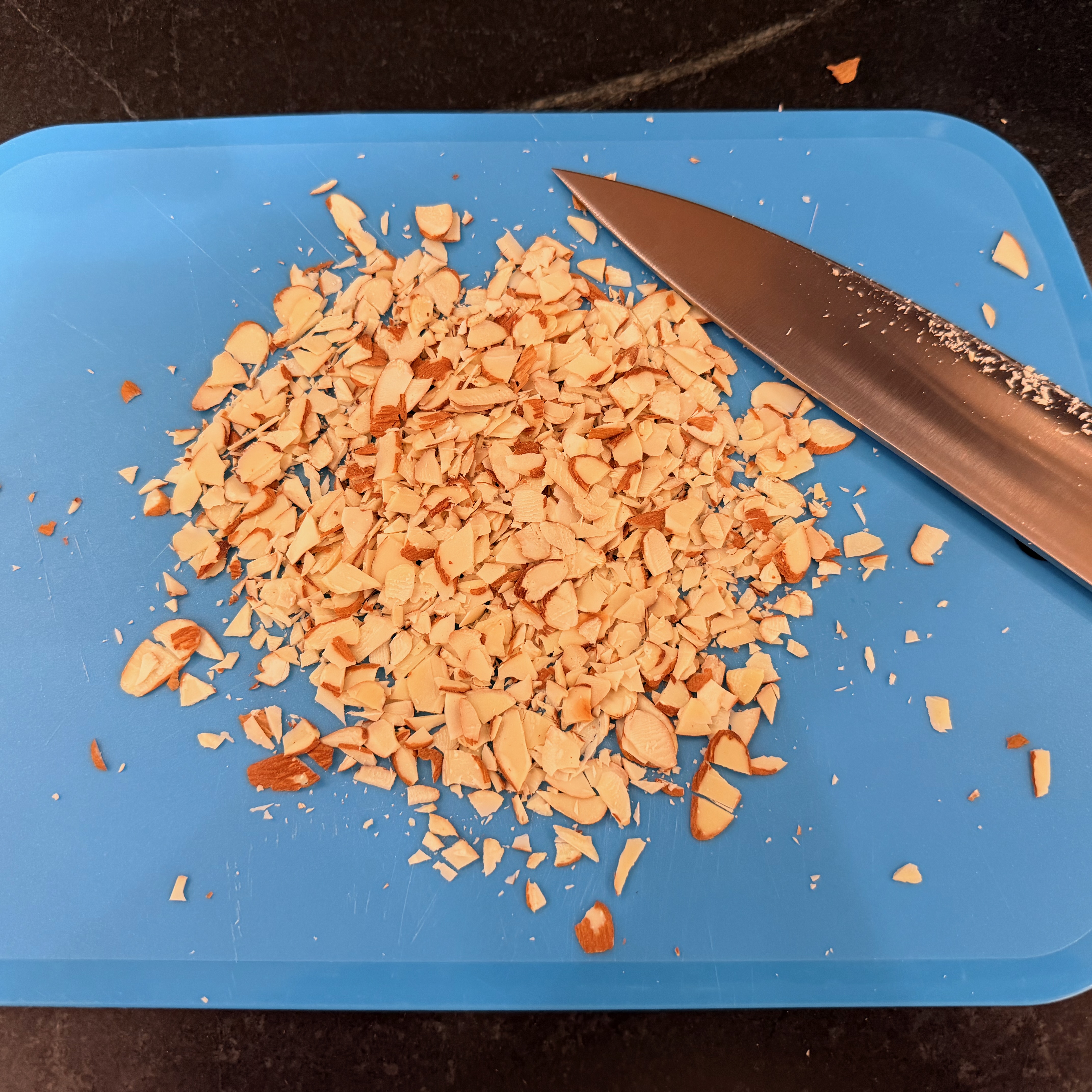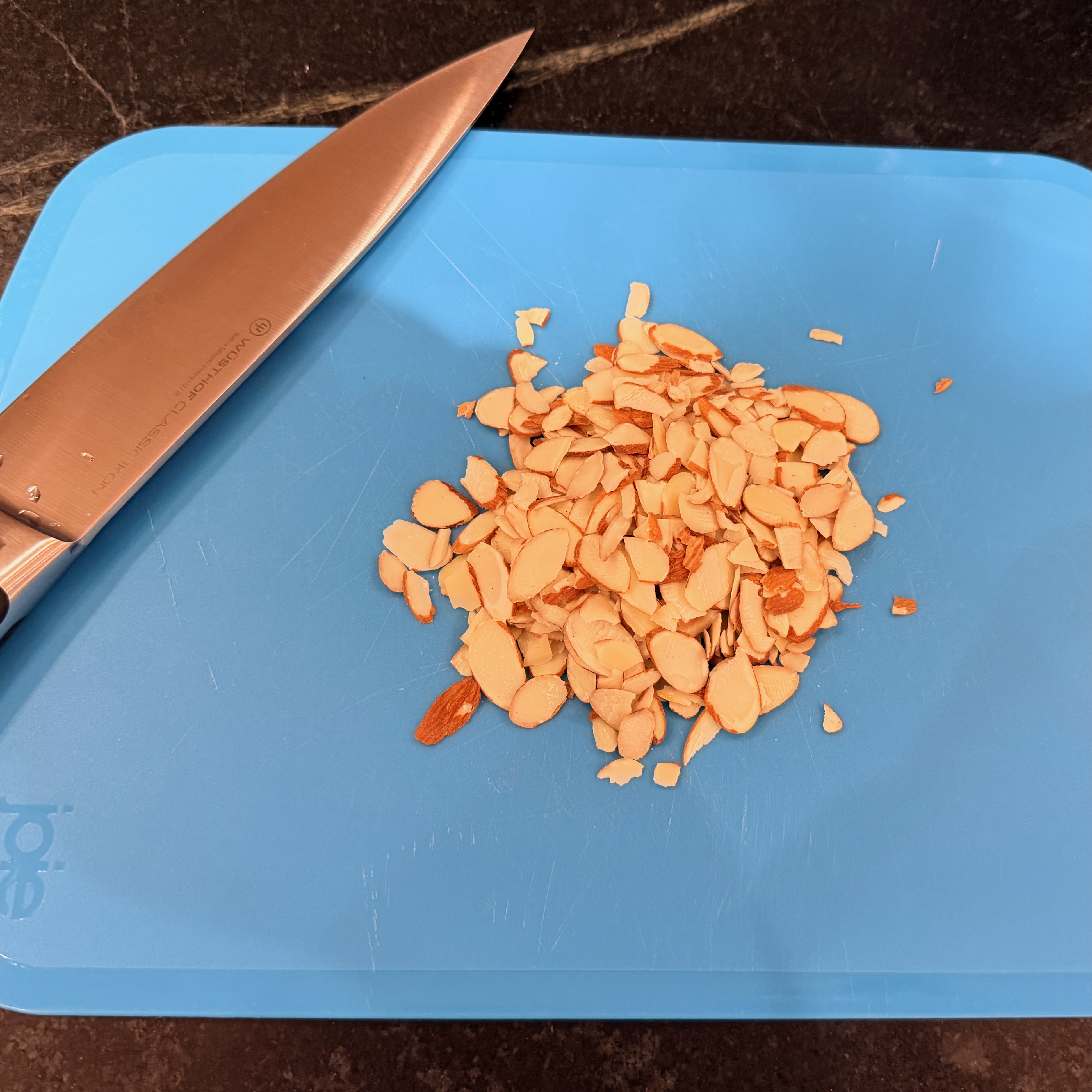- Measure out a pile of almond slices about half as big as your pile of bacon.