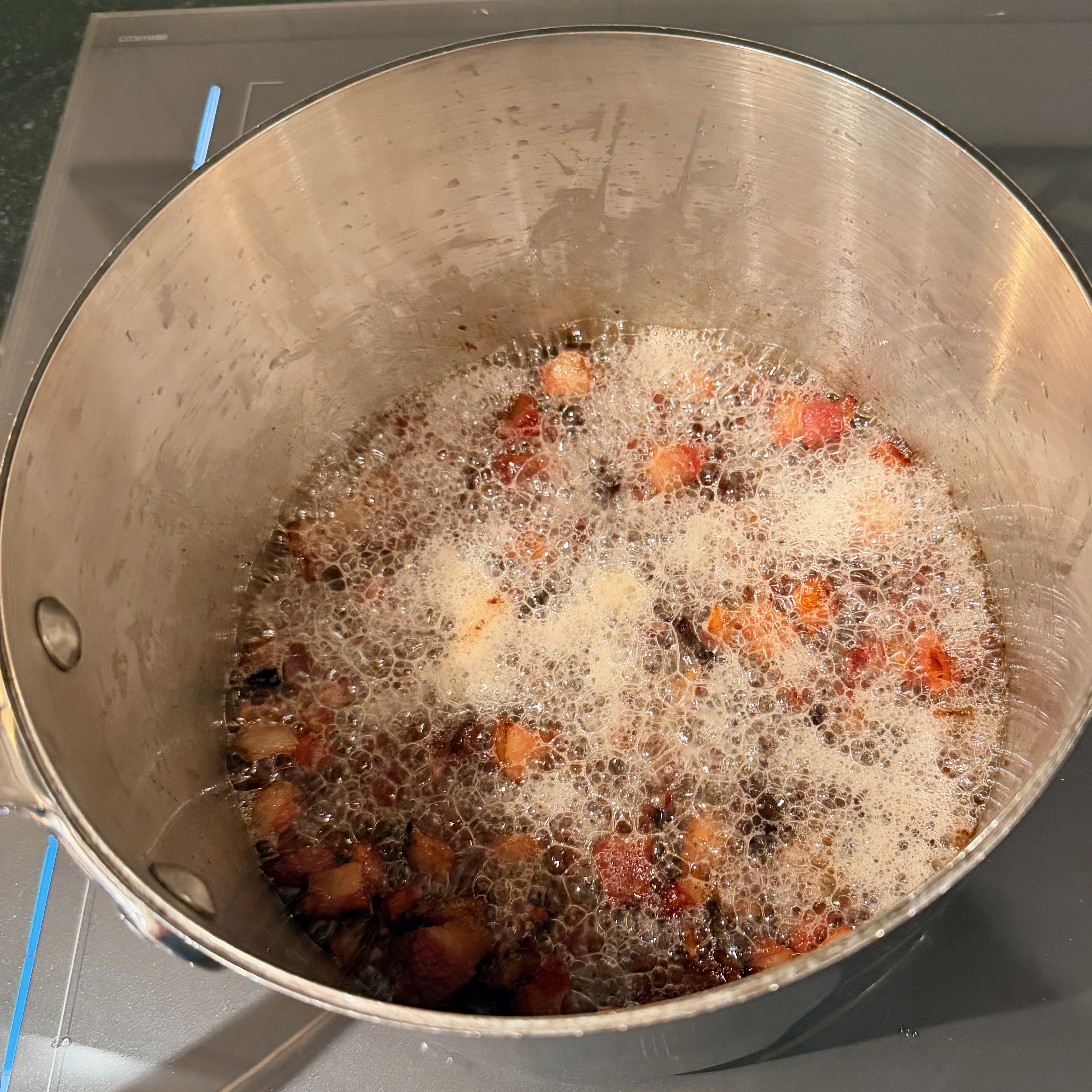 - Then uncover and continue to cook until the fat foams and the bacon is entirely rendered.