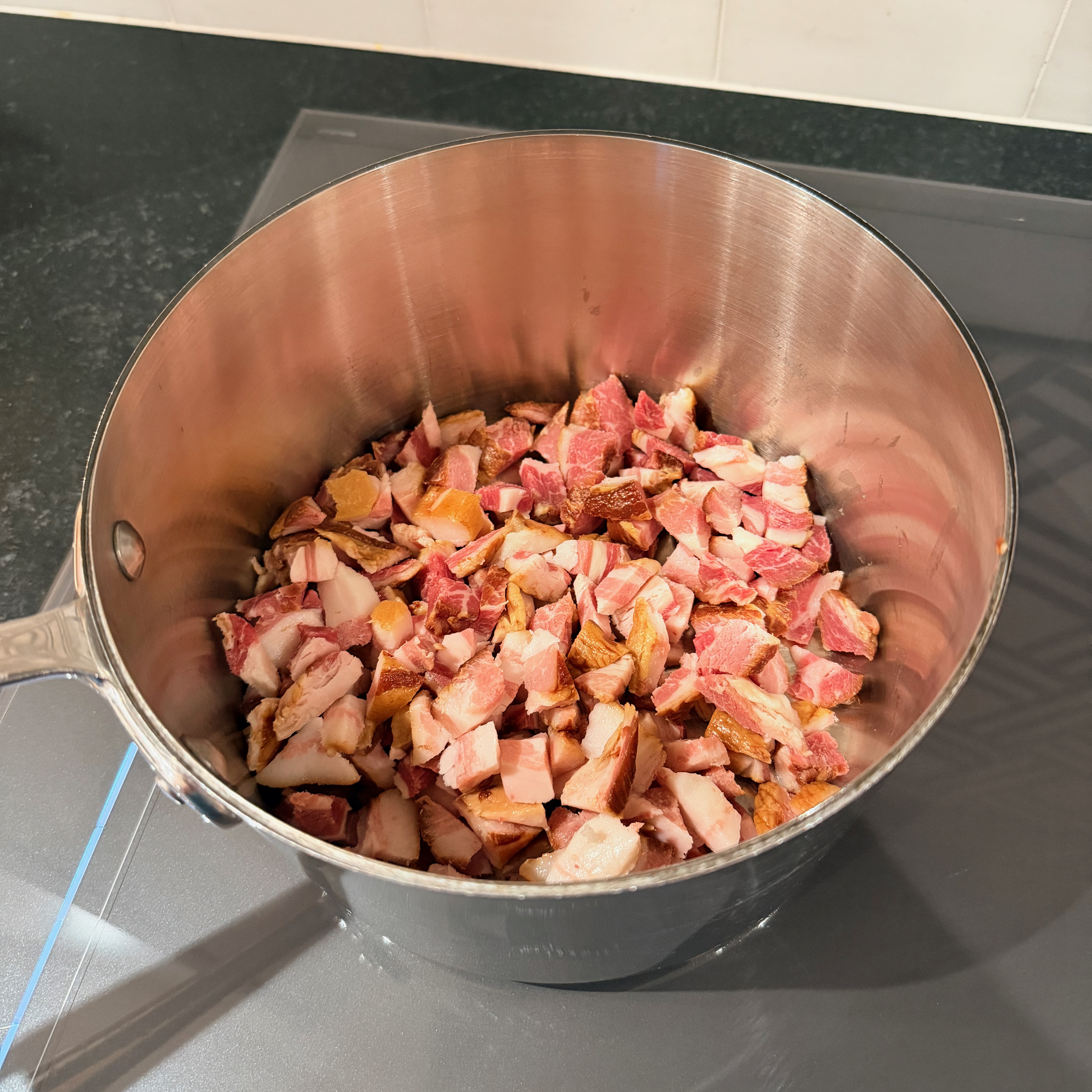 - Cut the bacon into small pieces using scissors. Aim for 1 cm cubed or thereabouts.