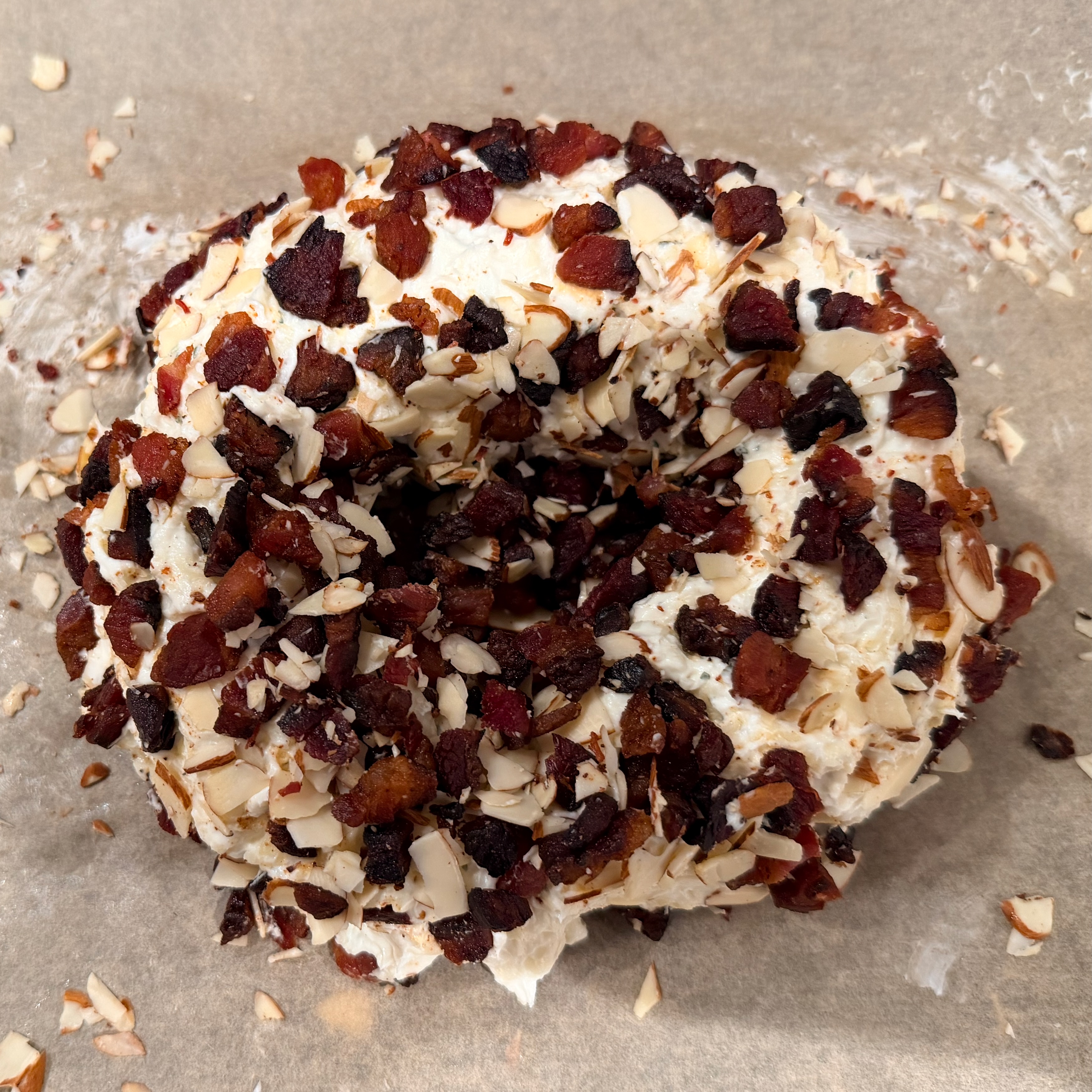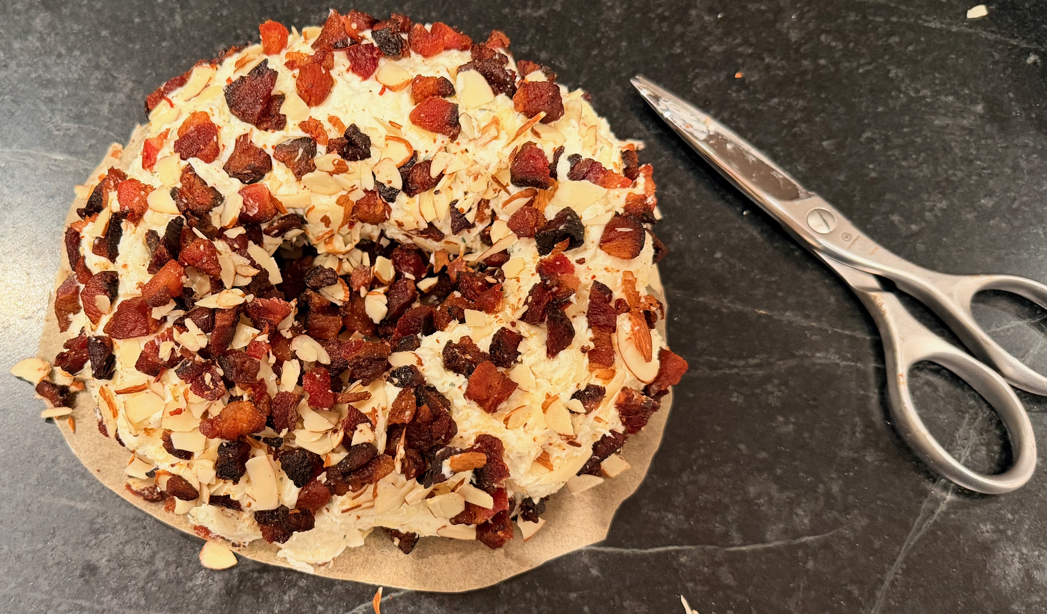 - Get out your big scary knife and chop the bacon and almonds. We aren’t looking for Michelin star worthy chives, let’s be honest we couldn’t do that if we wanted to. Just make things a little smaller so it’ll stick to the outside of the wreath.