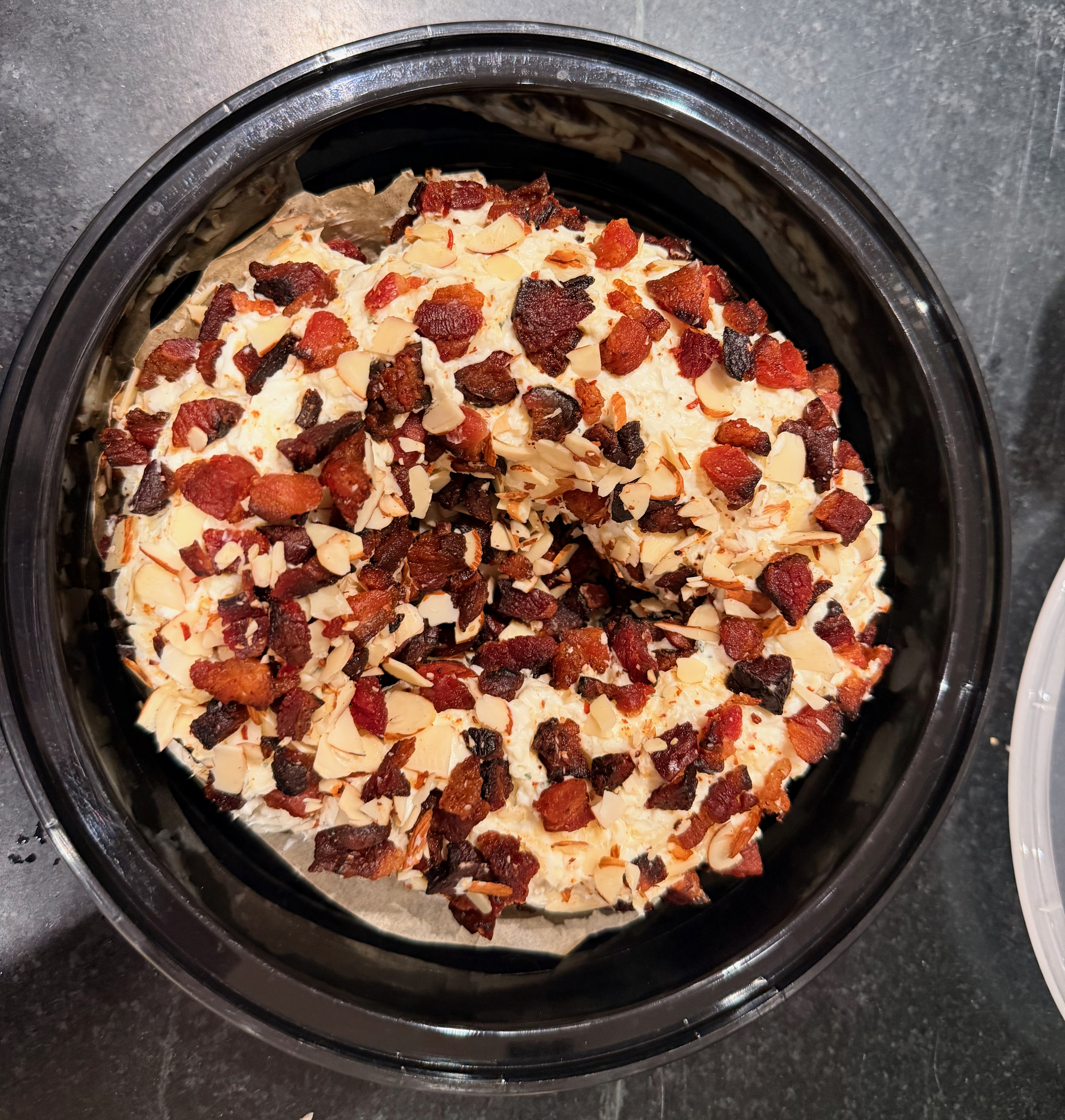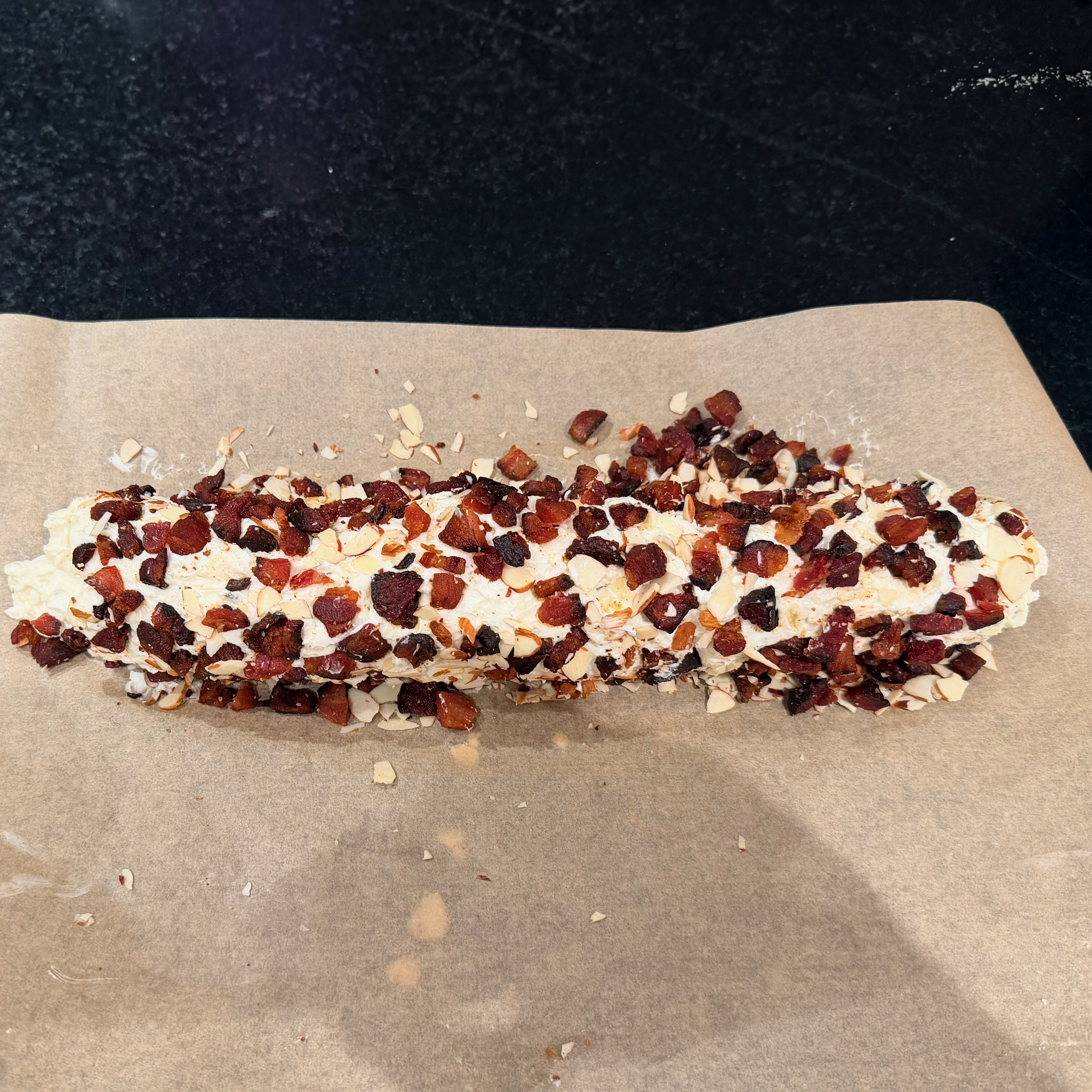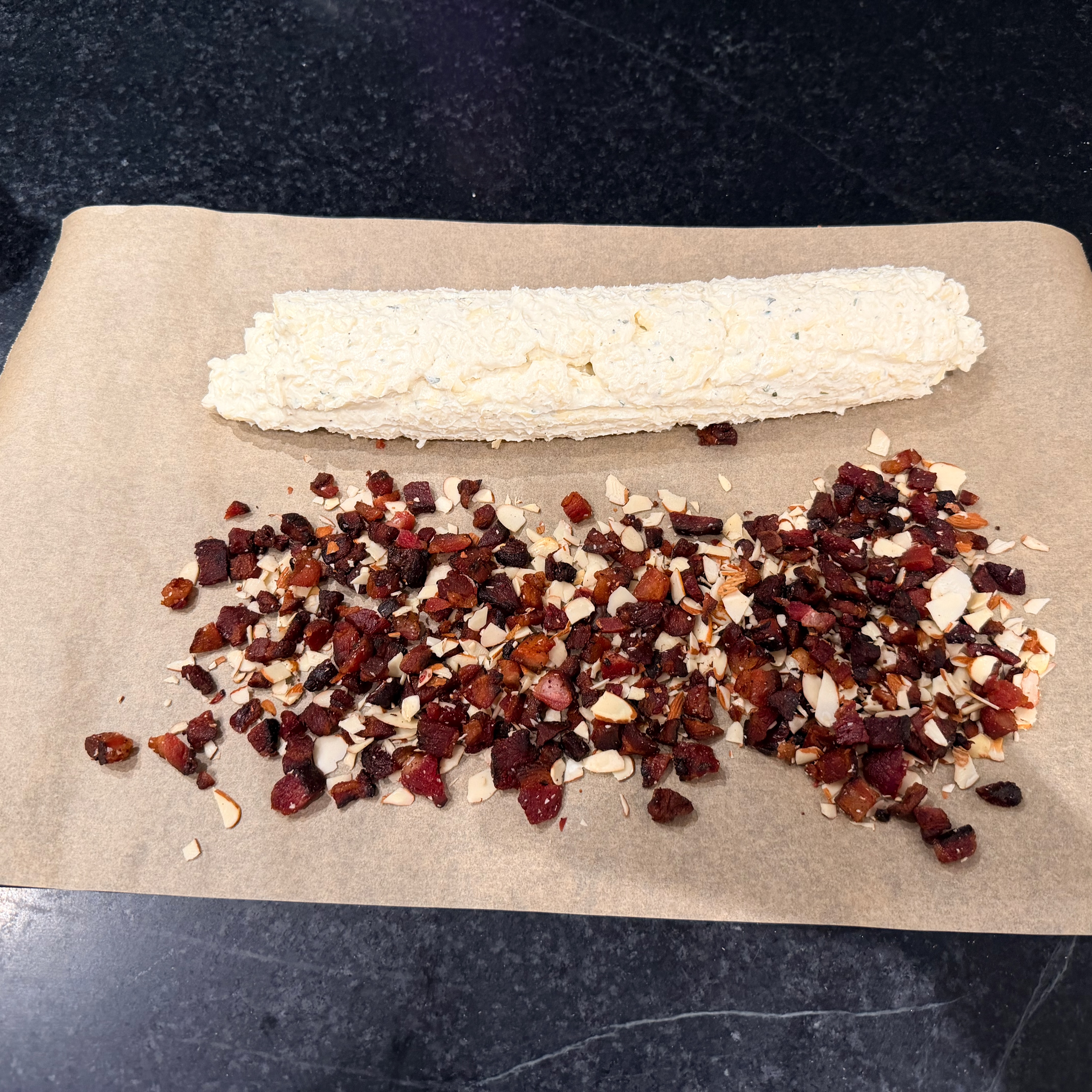 - On the second piece of parchment, spread out the bacon and almond mix into in a thin layer, next to your log.