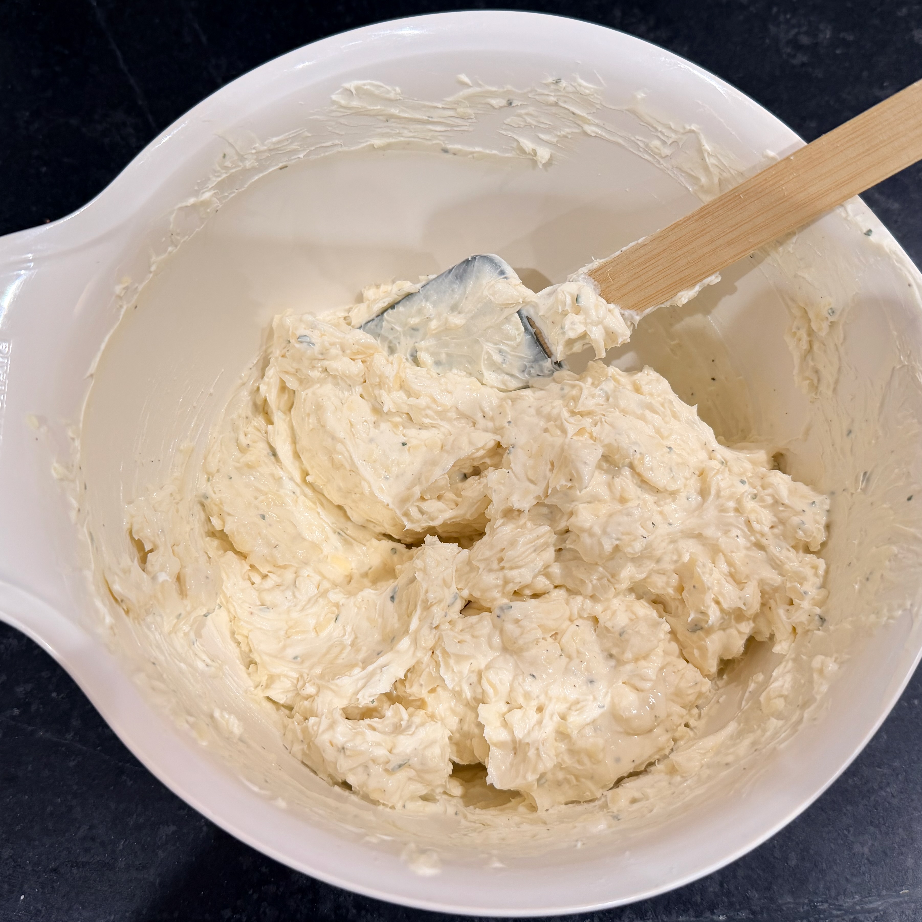 - Keep mixing until it’s smooth. Some strange chemical reaction happens causing the shredded cheese to “melt” into the cream cheese. The techincal term (that I made up) for this is deemulsification.