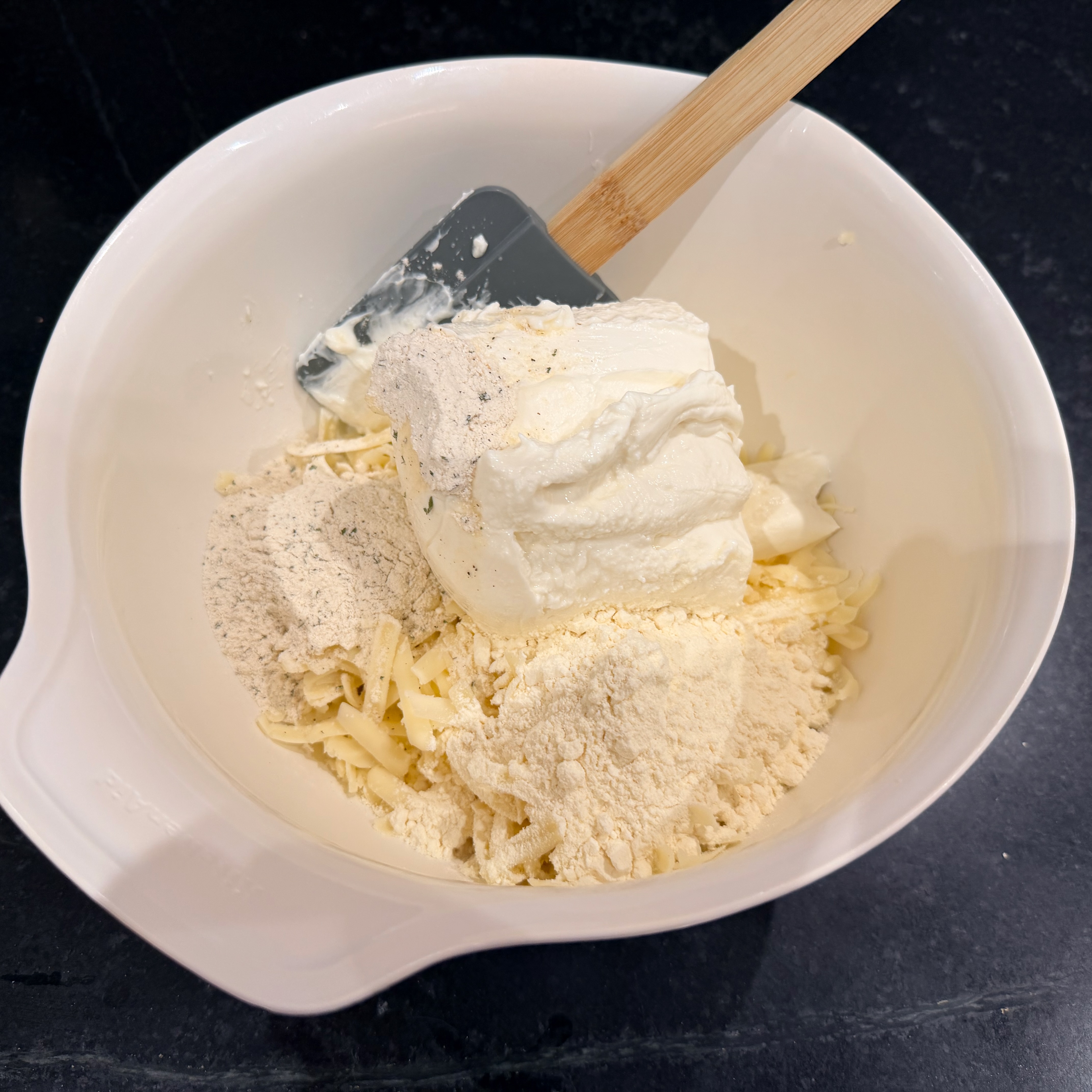 - In a large bowl, mix your shredded cheese, ranch powder, cheese powder and cream cheese together. This part sucks.