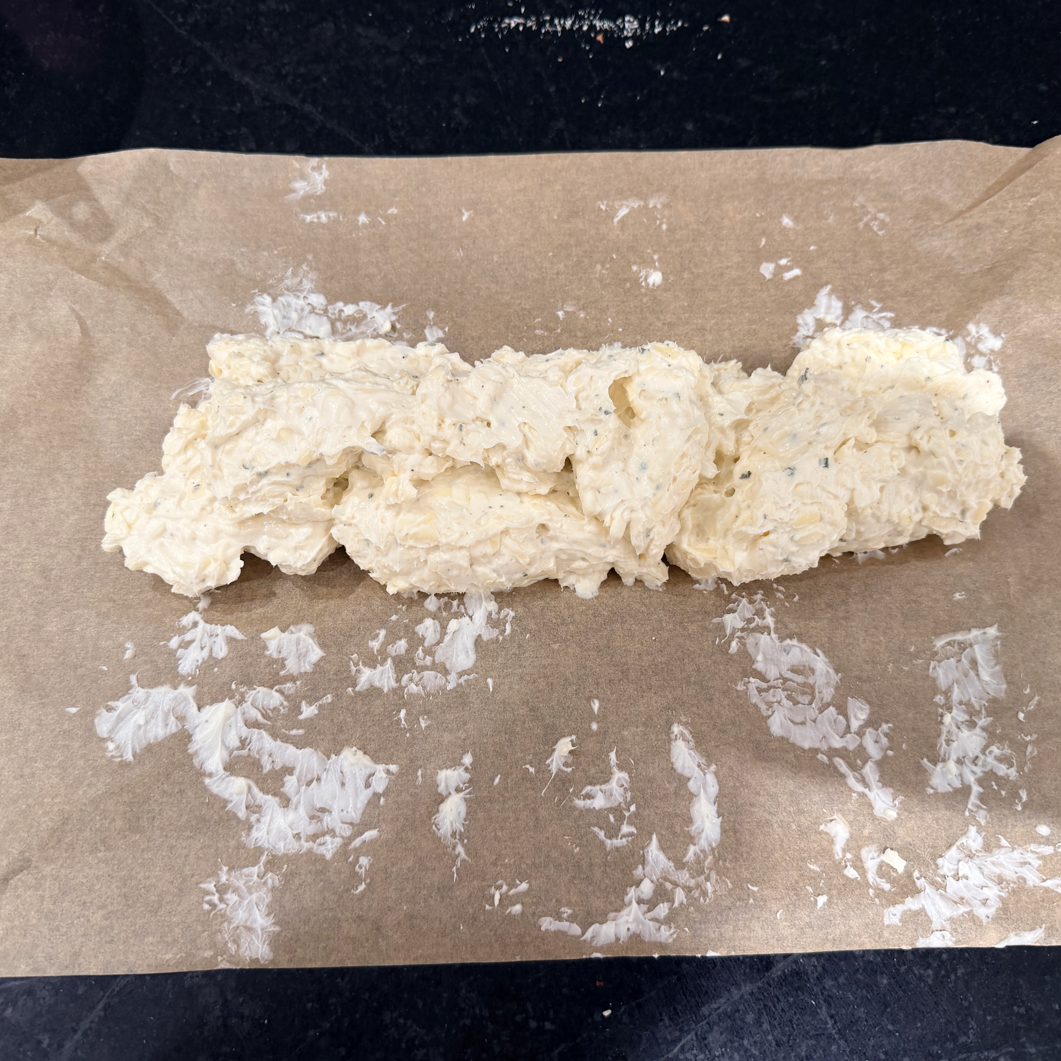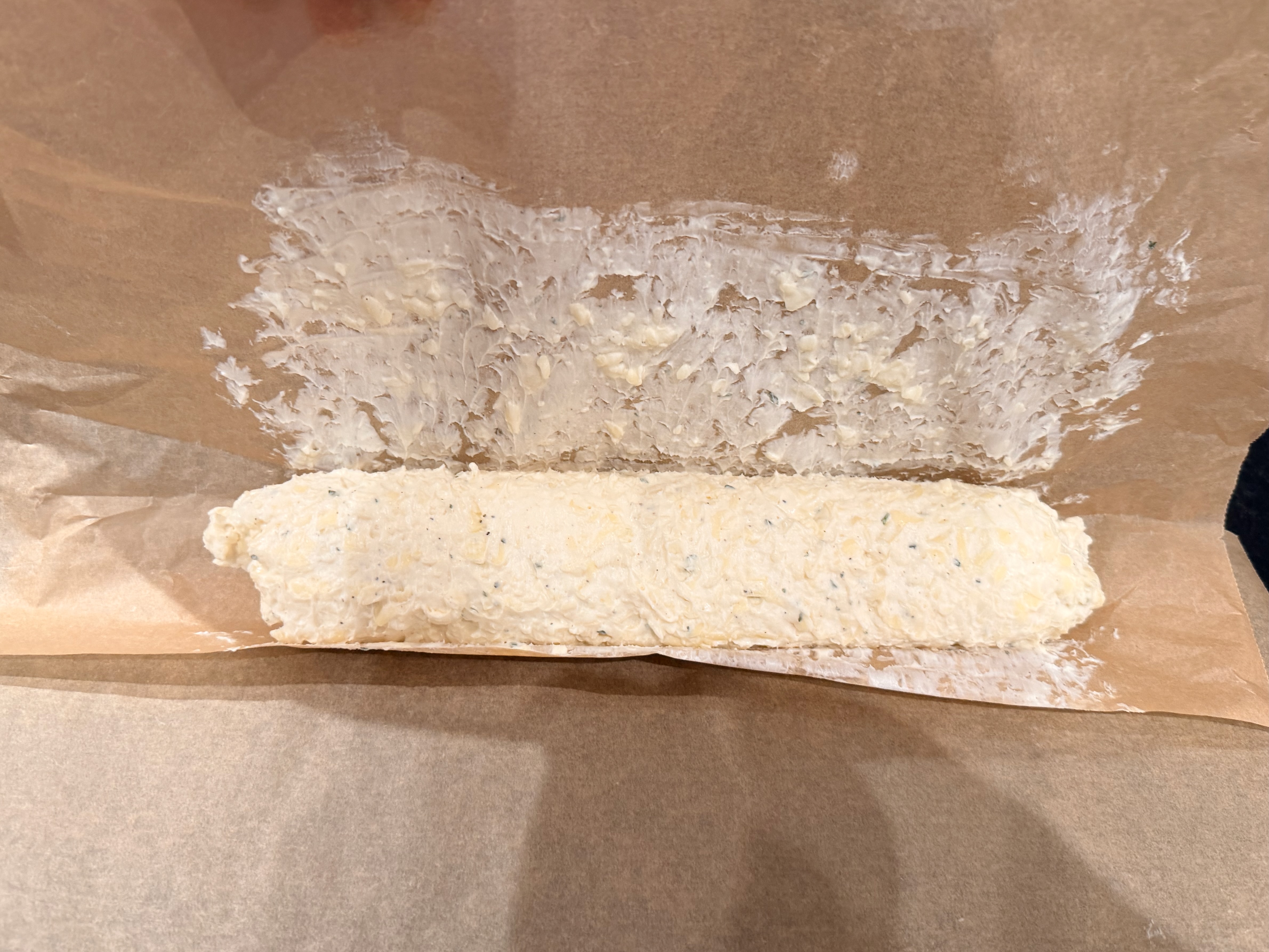 - On parchment, spread out your cheese mix into a vague log shape. Your aiming for about 9 inches long.
