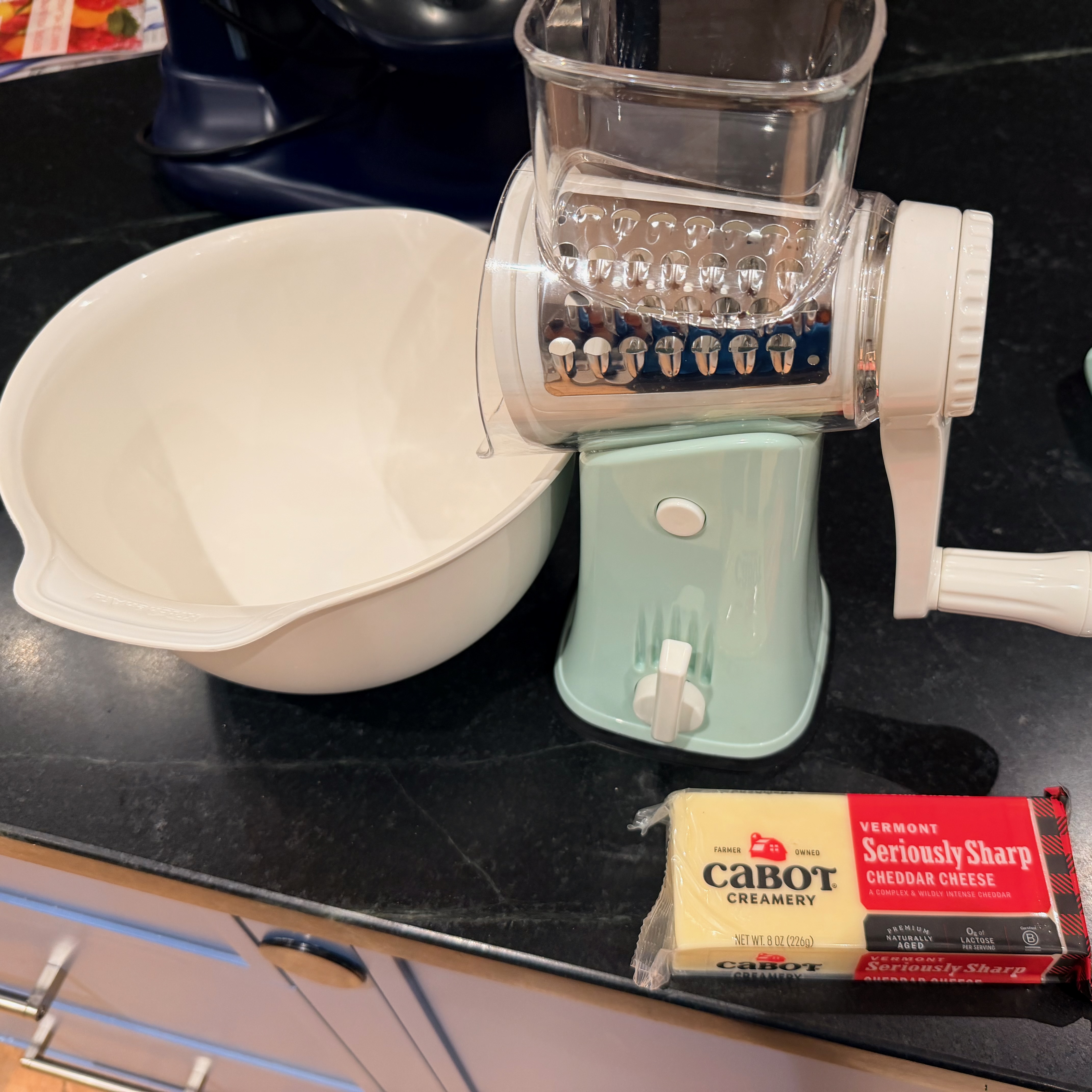- Finely shred your cheddar cheese. Eat the little nuggets that are left so you don’t hurt your fingies on the slicer. The finer you shred, the easier it will be to mix things later.